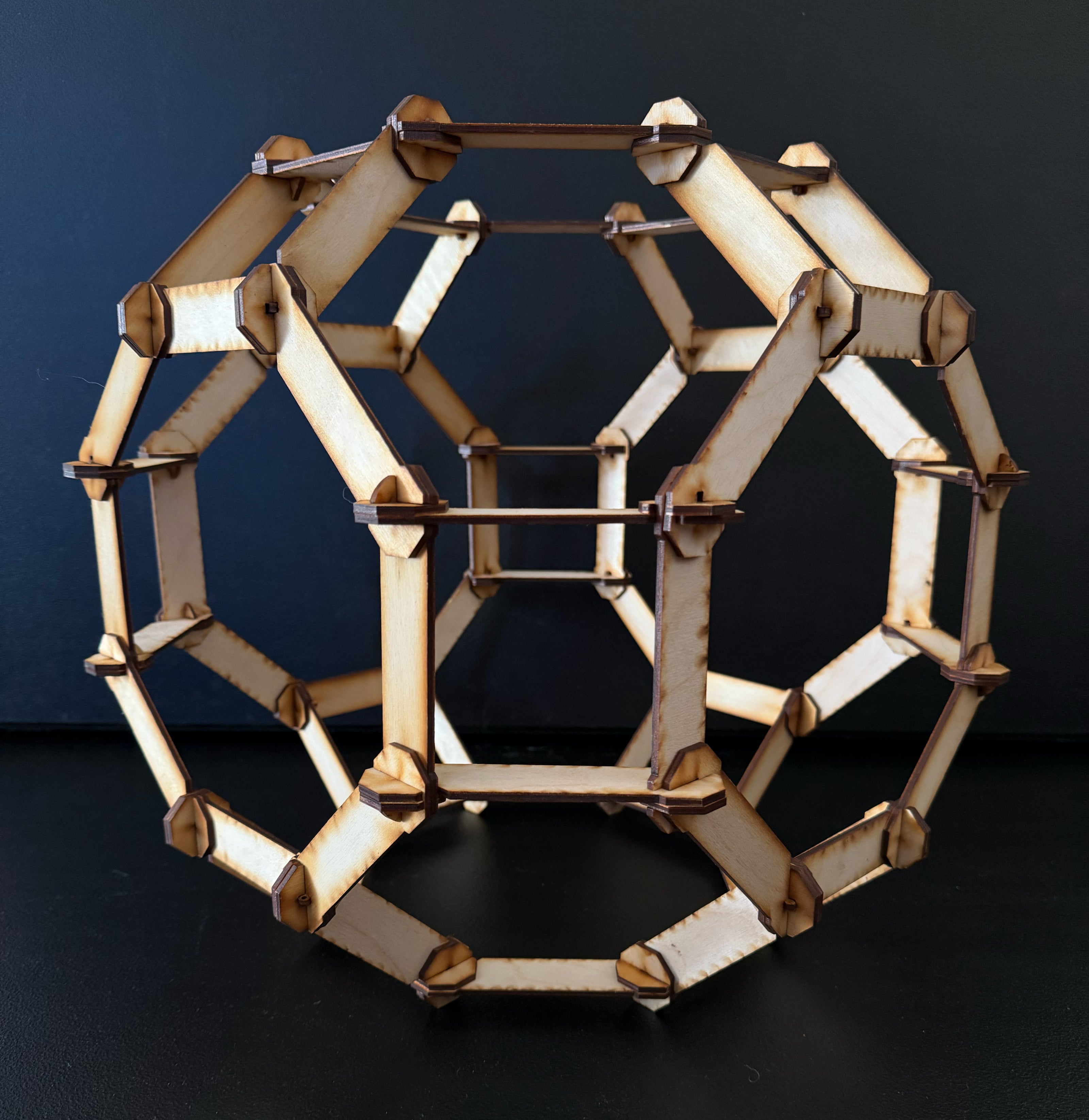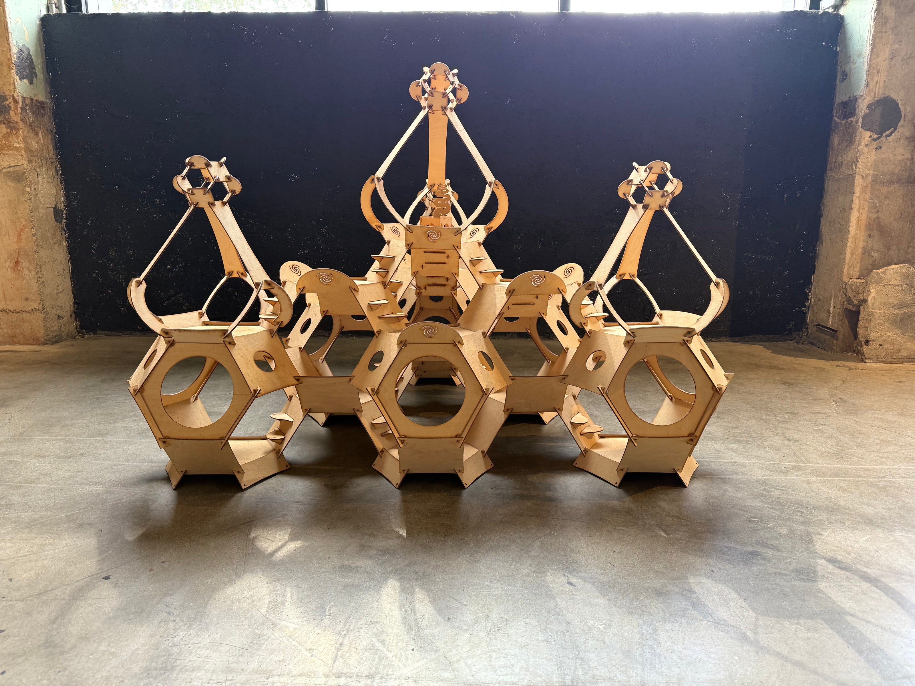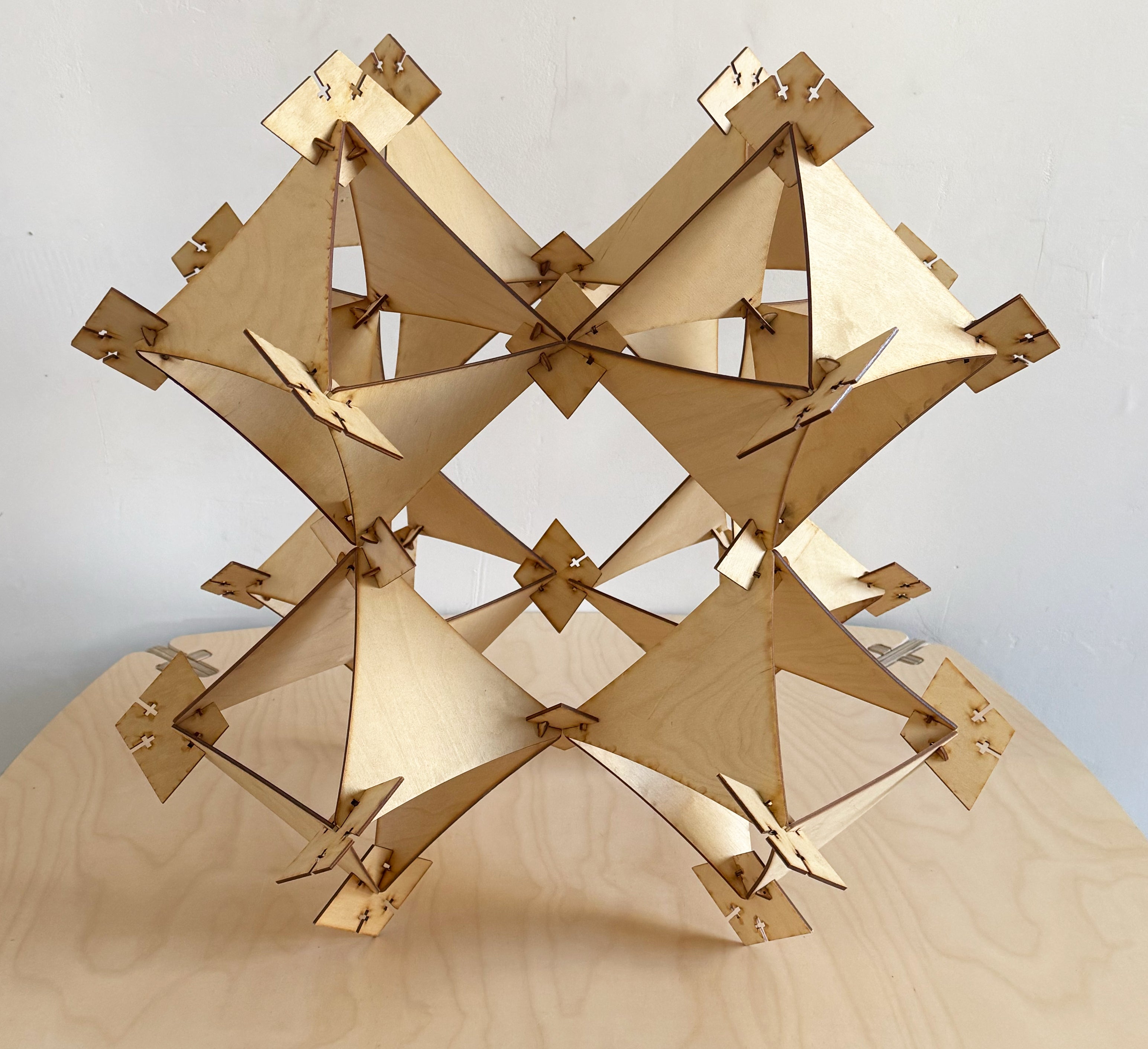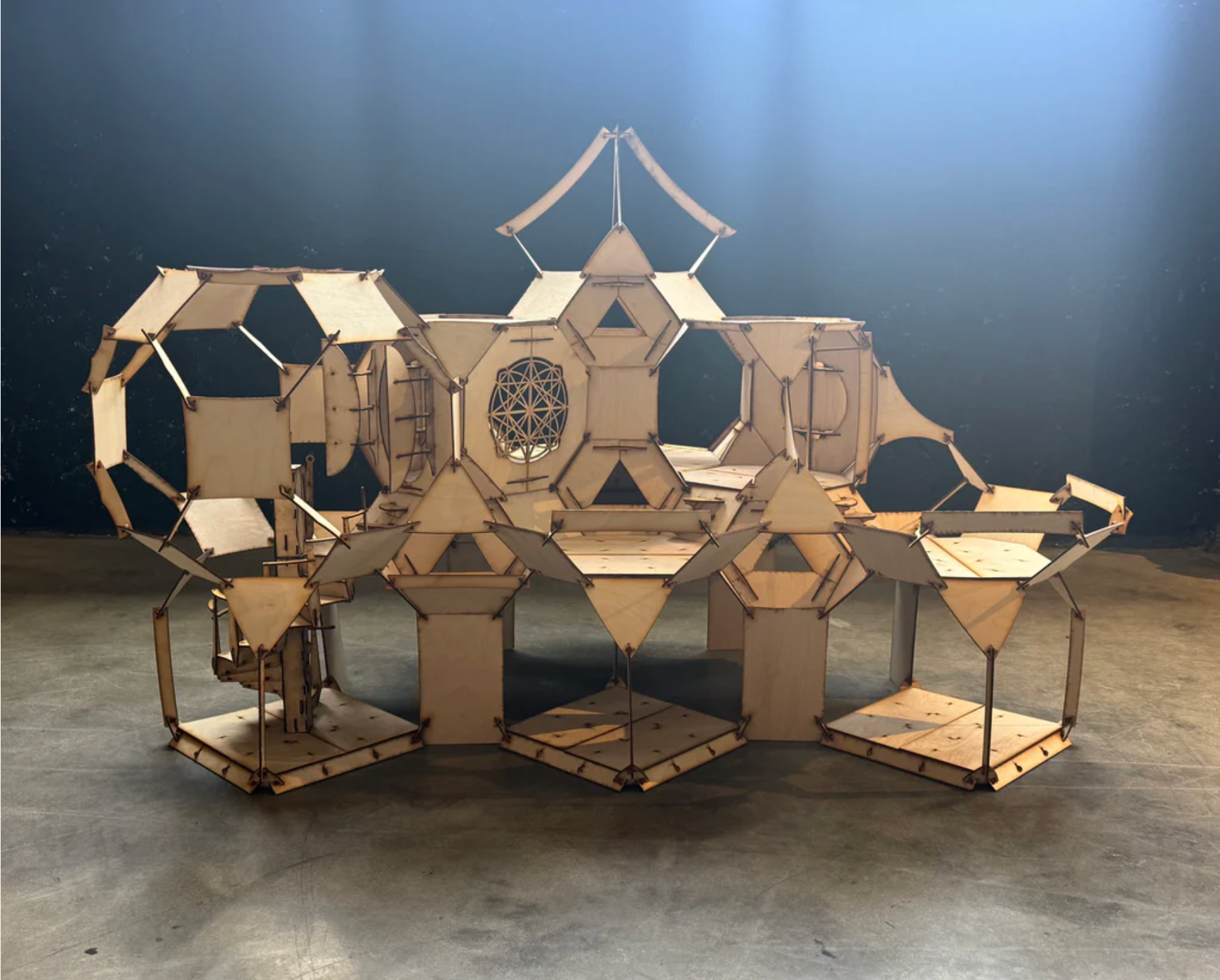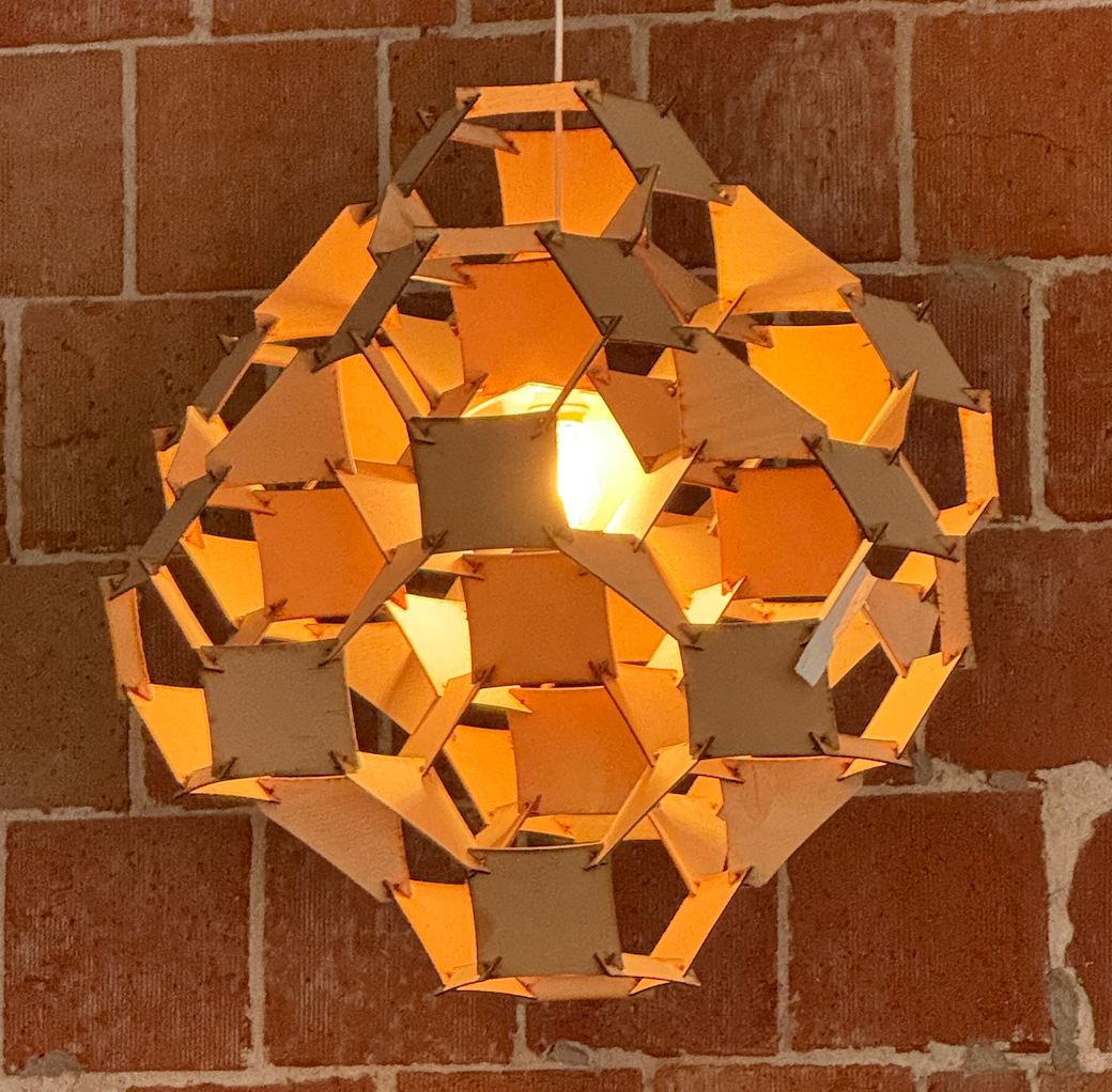 A cluster of truncated octahedrons, connected utilizing Gregg Fleishman's slot and pin technique requiring no metal or fasteners with a central light suspended.