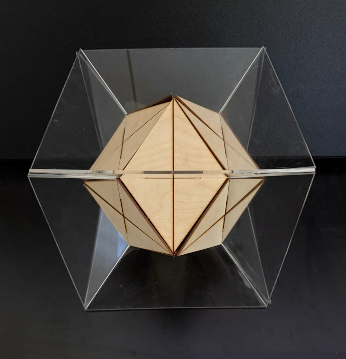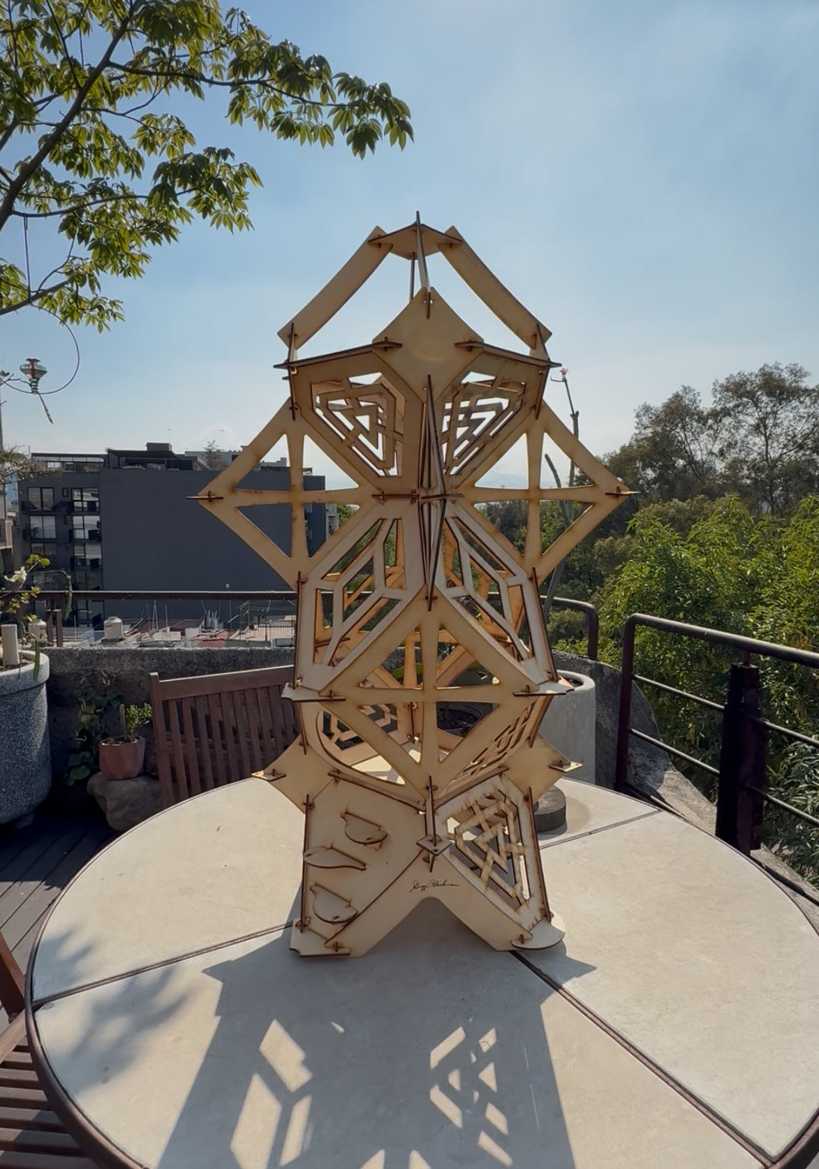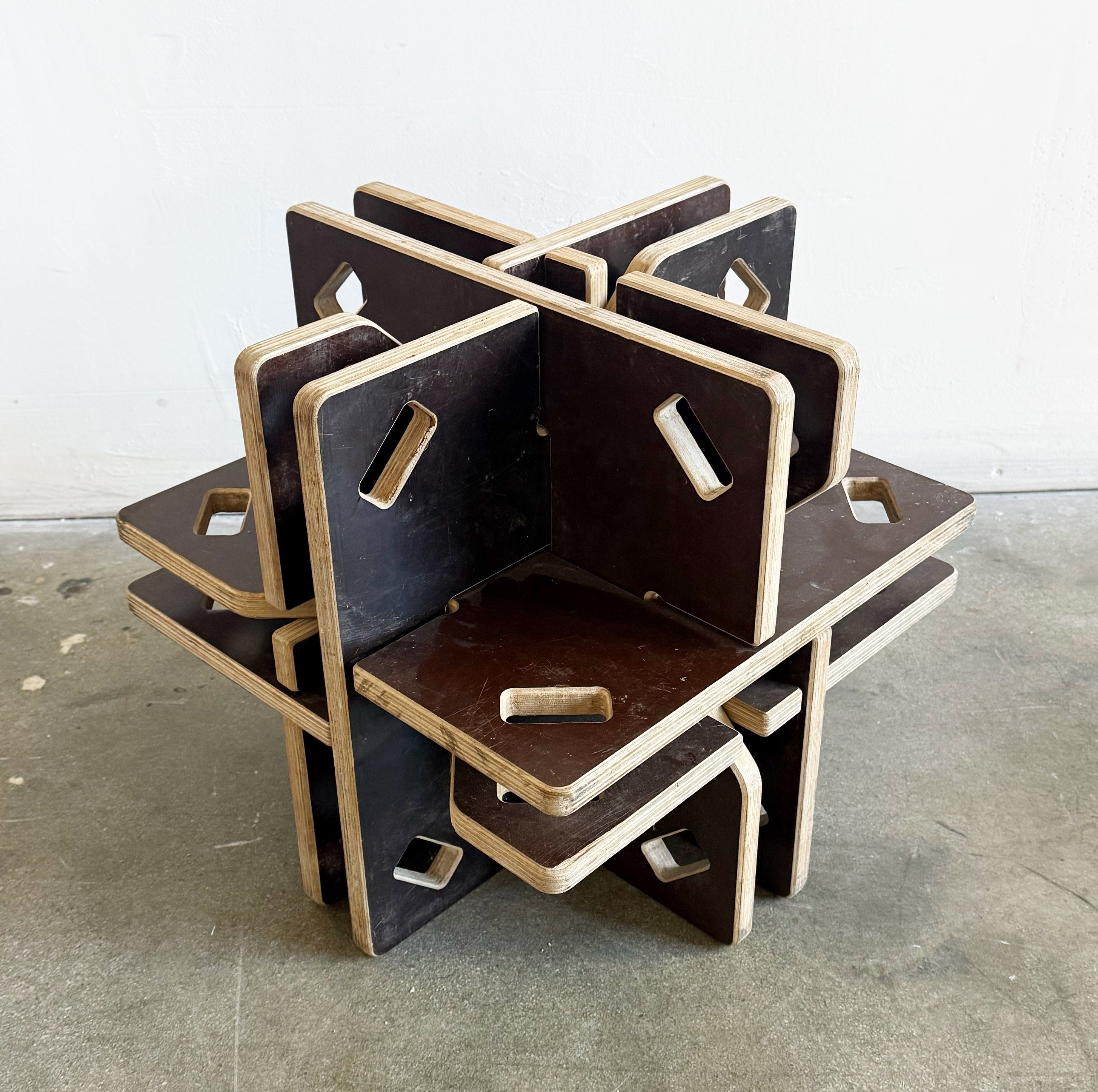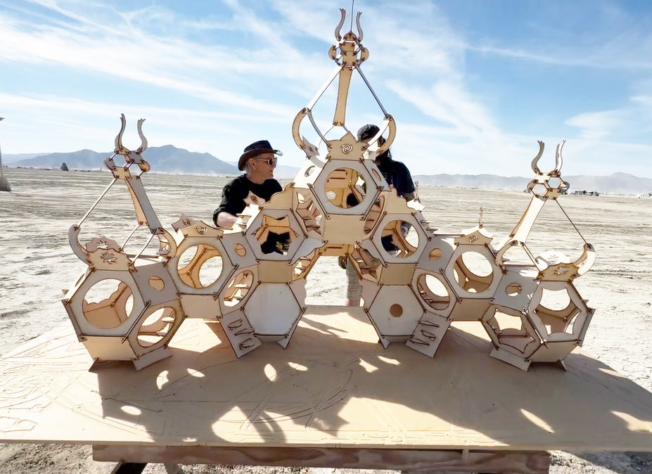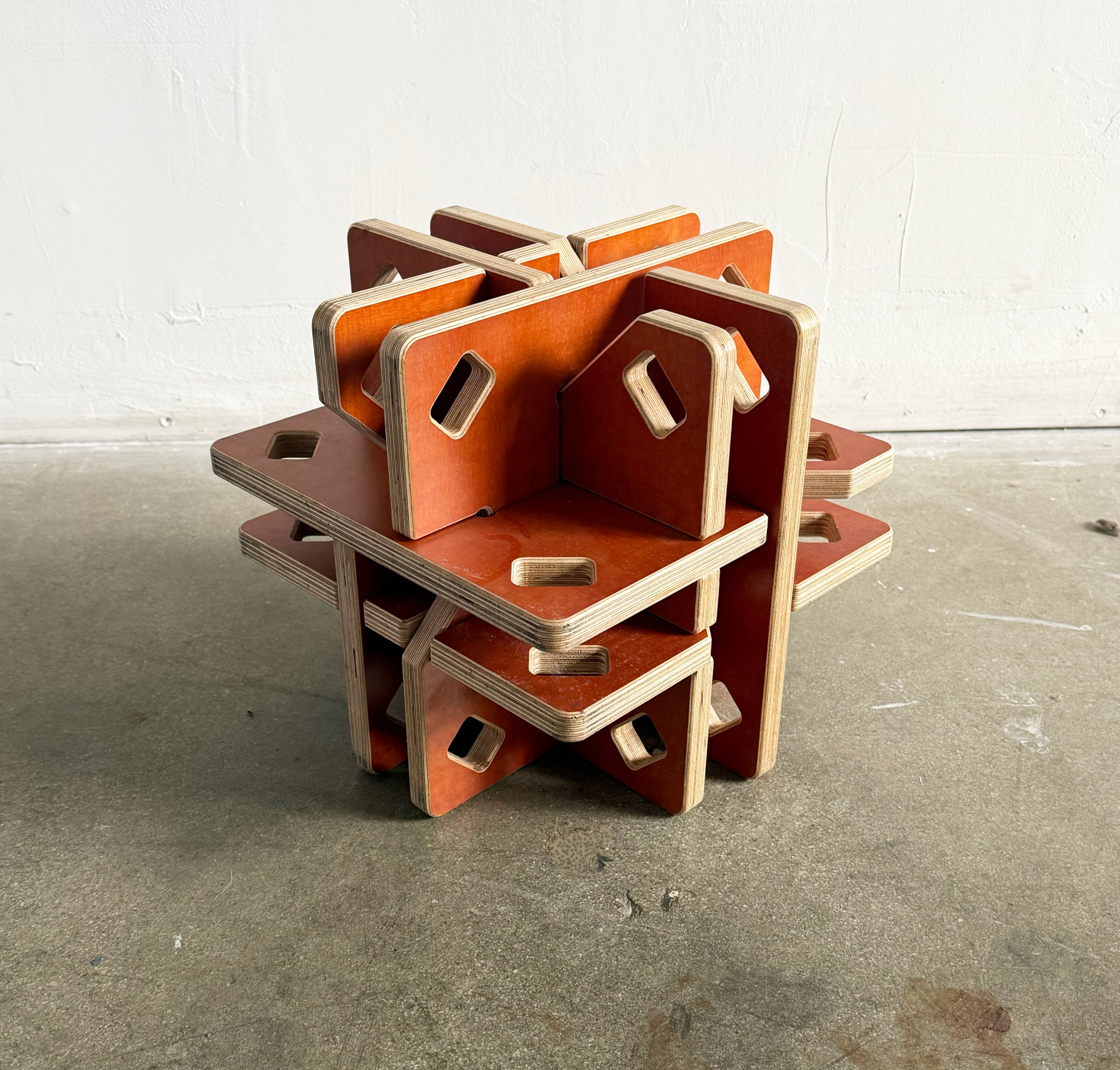 A cluster of truncated octahedrons, connected utilizing Gregg Fleishman's slot and pin technique requiring no metal or fasteners with a central light suspended.