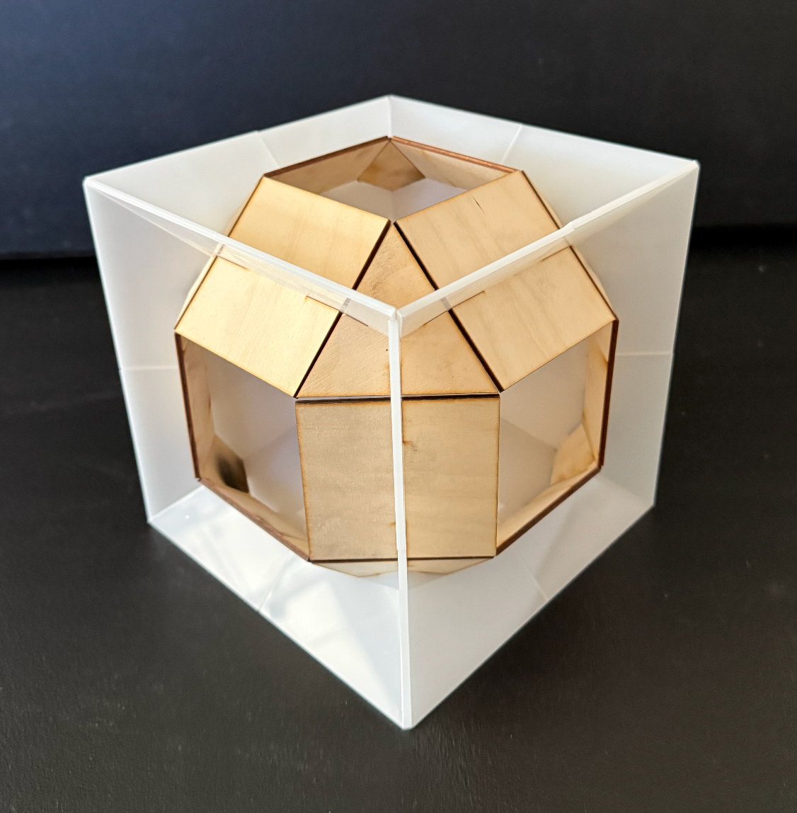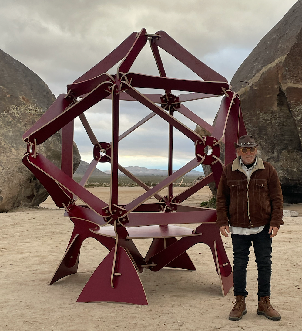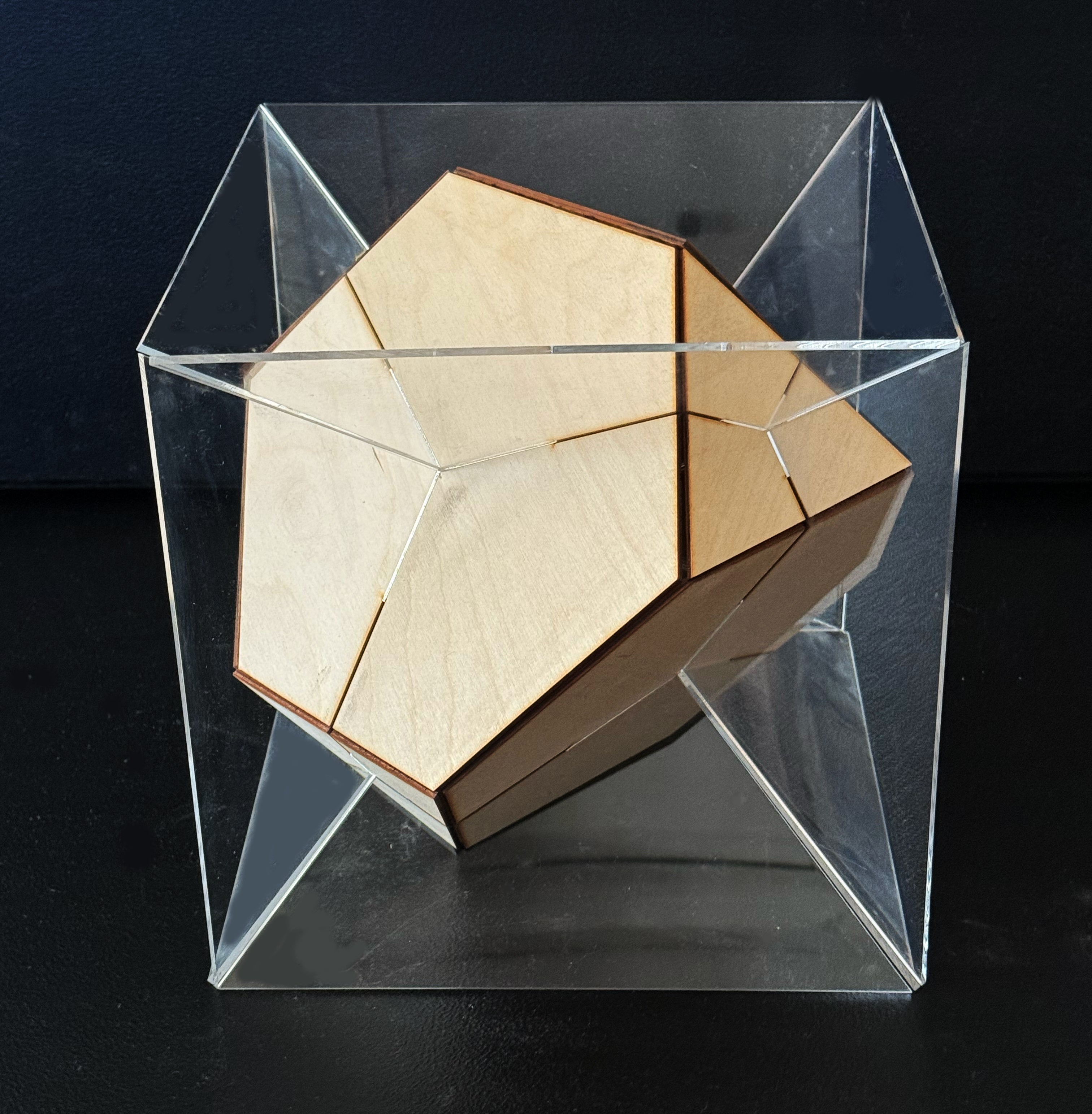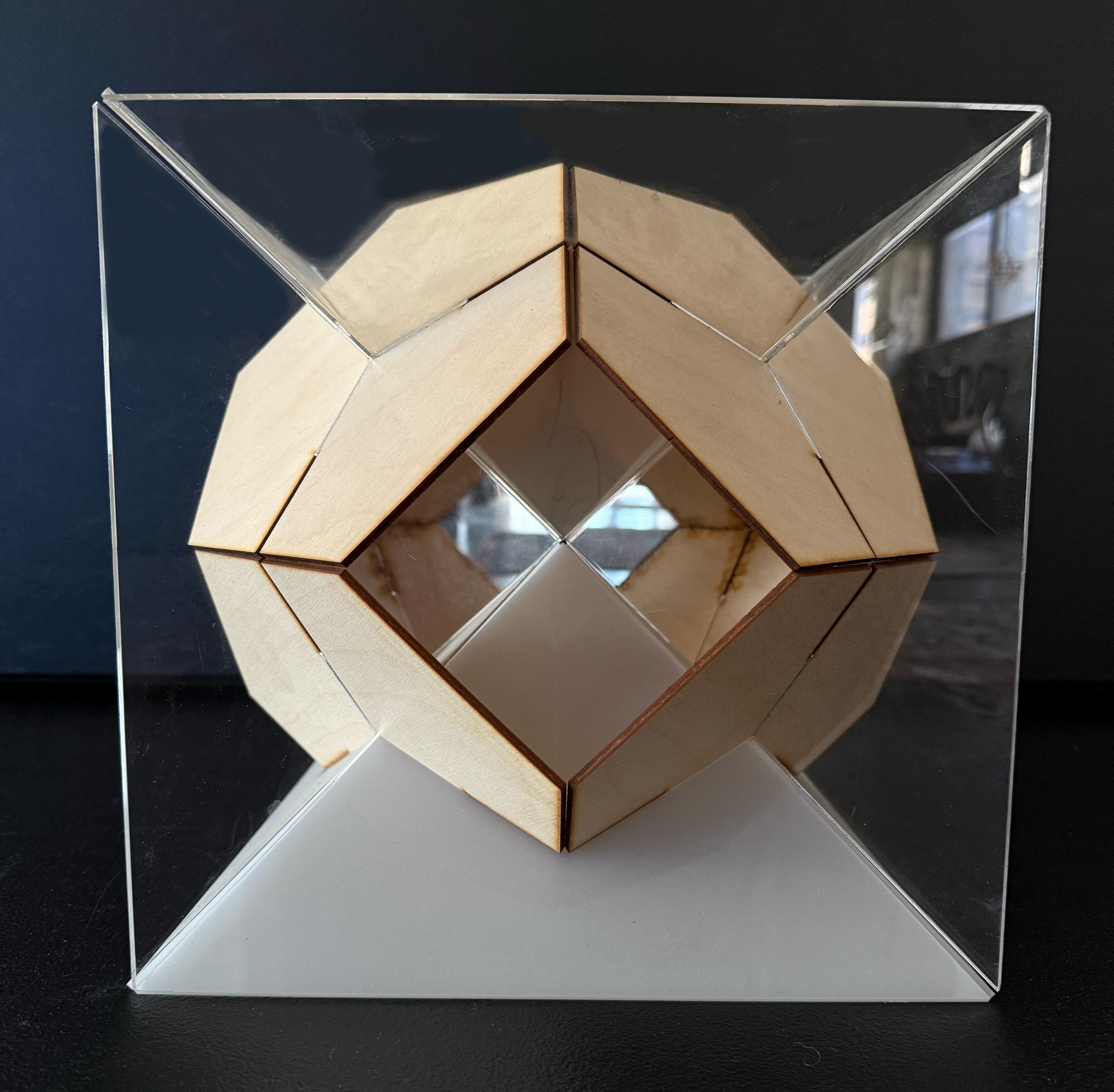 A rhombic dodecahedron combined with a cube, made with no metal or fasteners, held up by feet and contains an inner floor for meditation.