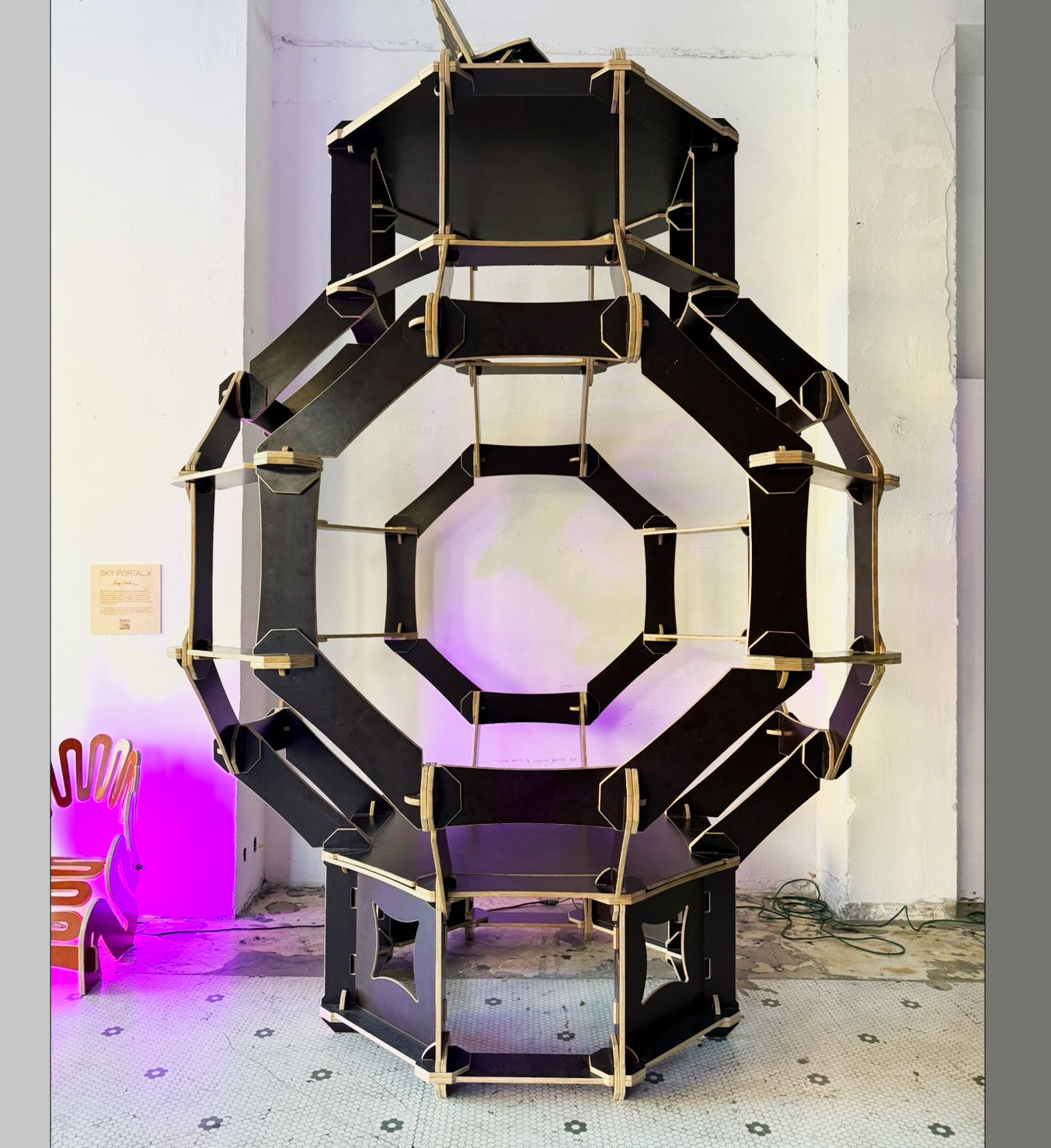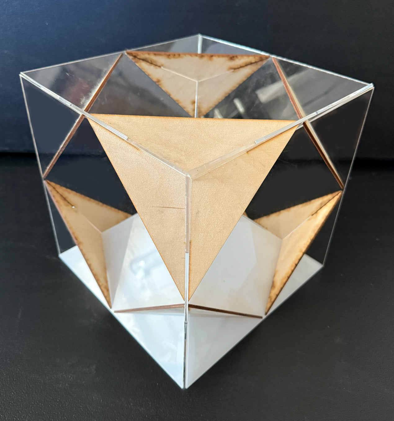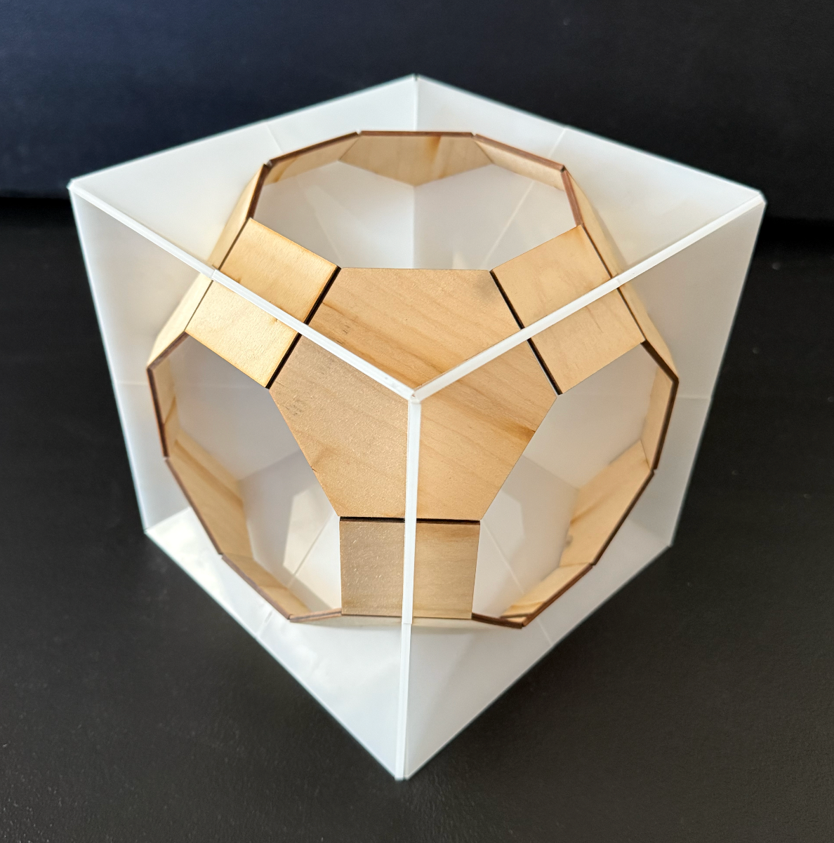 A rhombic dodecahedron combined with a cube, made with no metal or fasteners, held up by feet and contains an inner floor for meditation.